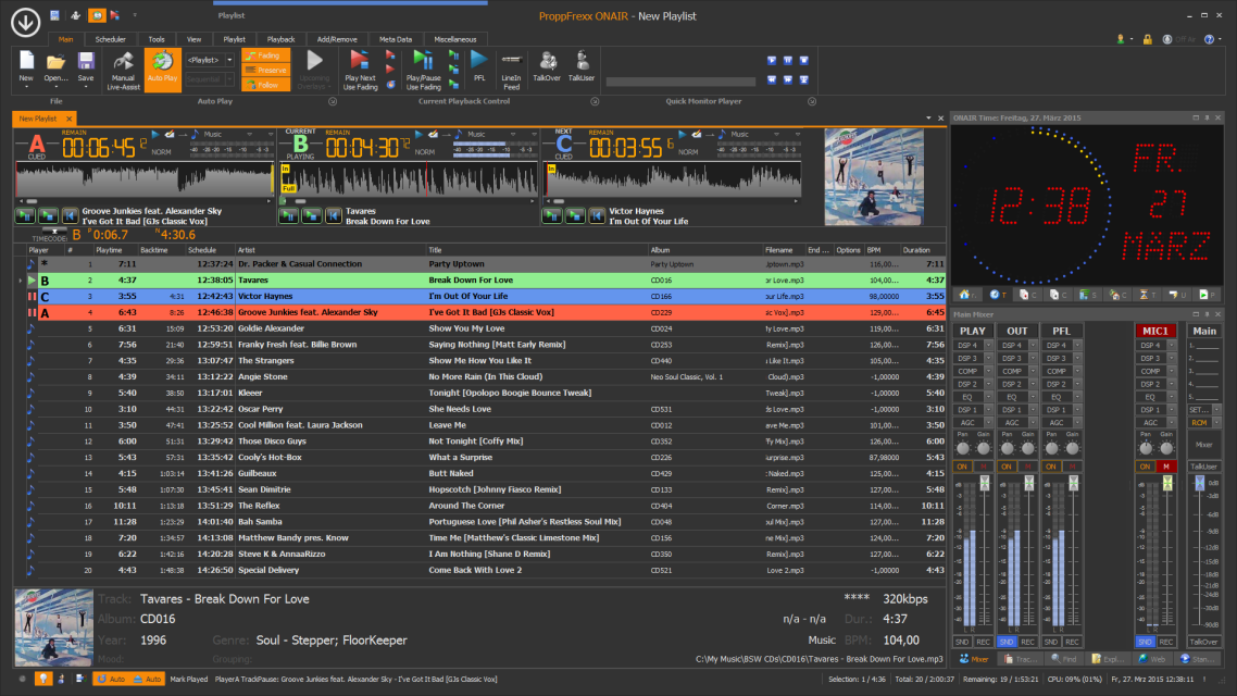 ProppFrexx ONAIR is a comprehensive playout and radio broadcast automation software system designed for general On-Air operations (live assist and/or automation), may it be for large terrestrial radio stations or smaller web radio stations, operated live or mostly automated. ProppFrexx ONAIR is designed to serve you with the highest audio quality for real 24 by 7 by 365 operations containing all features needed to support your daily workflow.