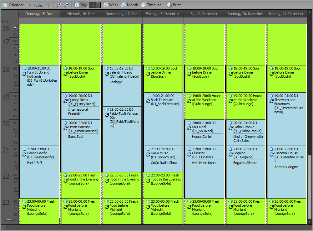 Two independent and outlook-like schedulers (one driving your regular programs and one serving extra overlays) offer maximum flexibility and automation capabilities. No funky coding or programming language needed. A UI driven scripting allows full configuration of your planned hours. From fix time elements, time update syncs, soft, ends-at or hard segues up to conditional rules and remaining time based scheduling.
