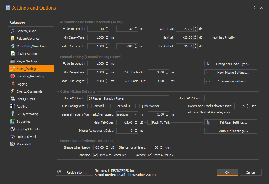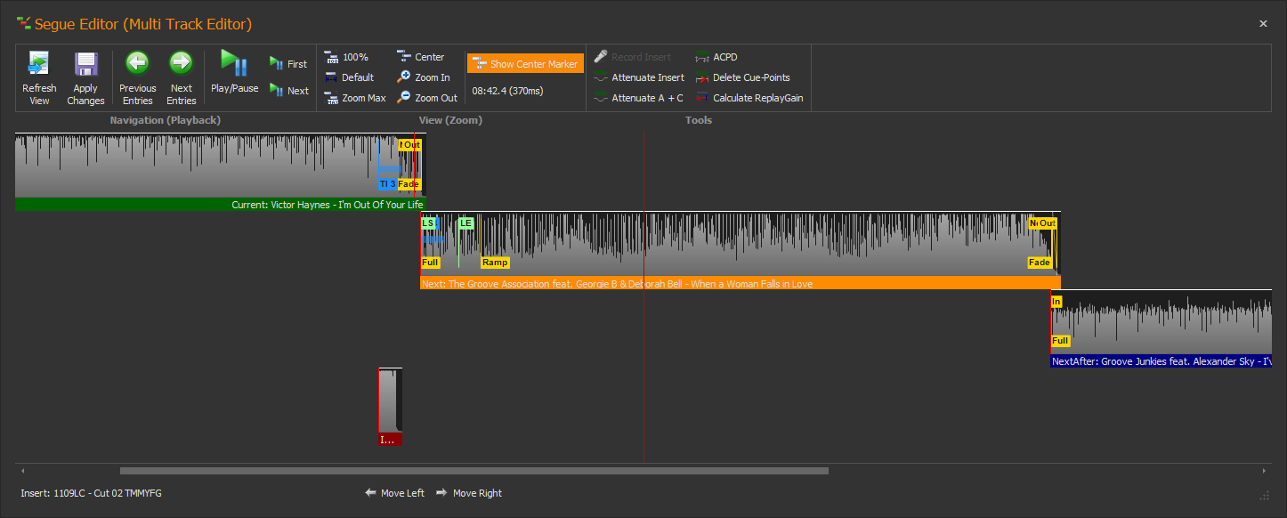 The integrated graphical segue editor makes mixing on-the-fly as simple as drag and drop of WaveForms. In addition you can use our automatic cue-point detection engine (ACPD) on a per media entry type basis or leverage perfect reply gain calculation.