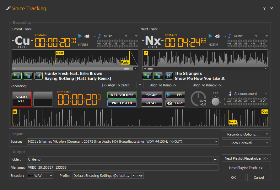 Perfect in advance or last minute preparation of playlists require an easy-to-use voice tracking model. This is given, with an extra cartwall, a simple three-state recording button, automatic or manual track alignment and even unlimited track inserts. Remote Voice Tracking from a home location is also fully supported!