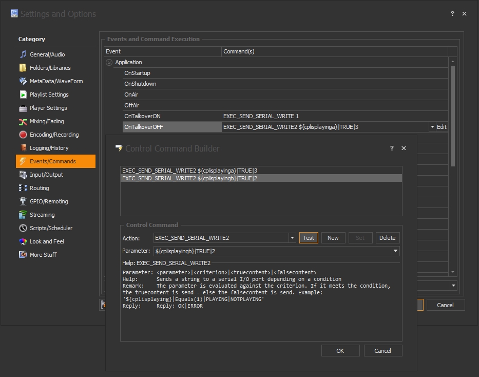Ich hätte vorgehabt zwei Exec_Serial_Write2 Kommandos in das Event: OnTalkoverOFF einzugeben,