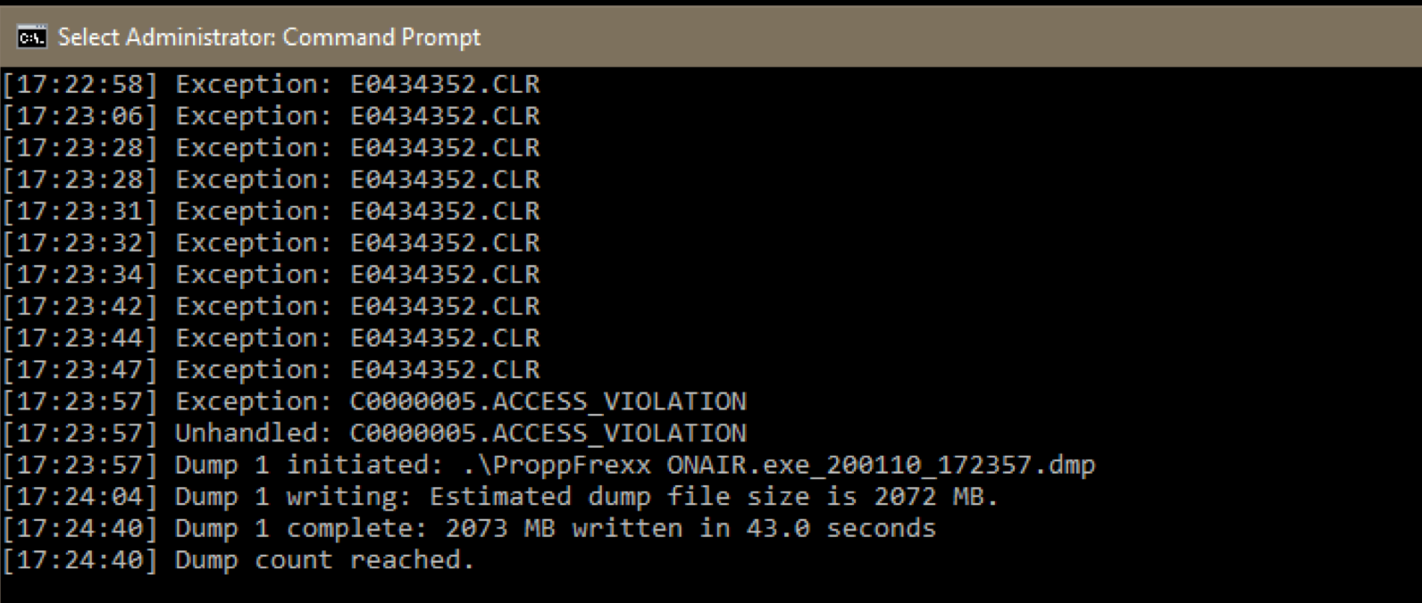 Sorry, no dump as I had to restart ProppFrexx the last two times quickly due to crashing in the middle of live shows.