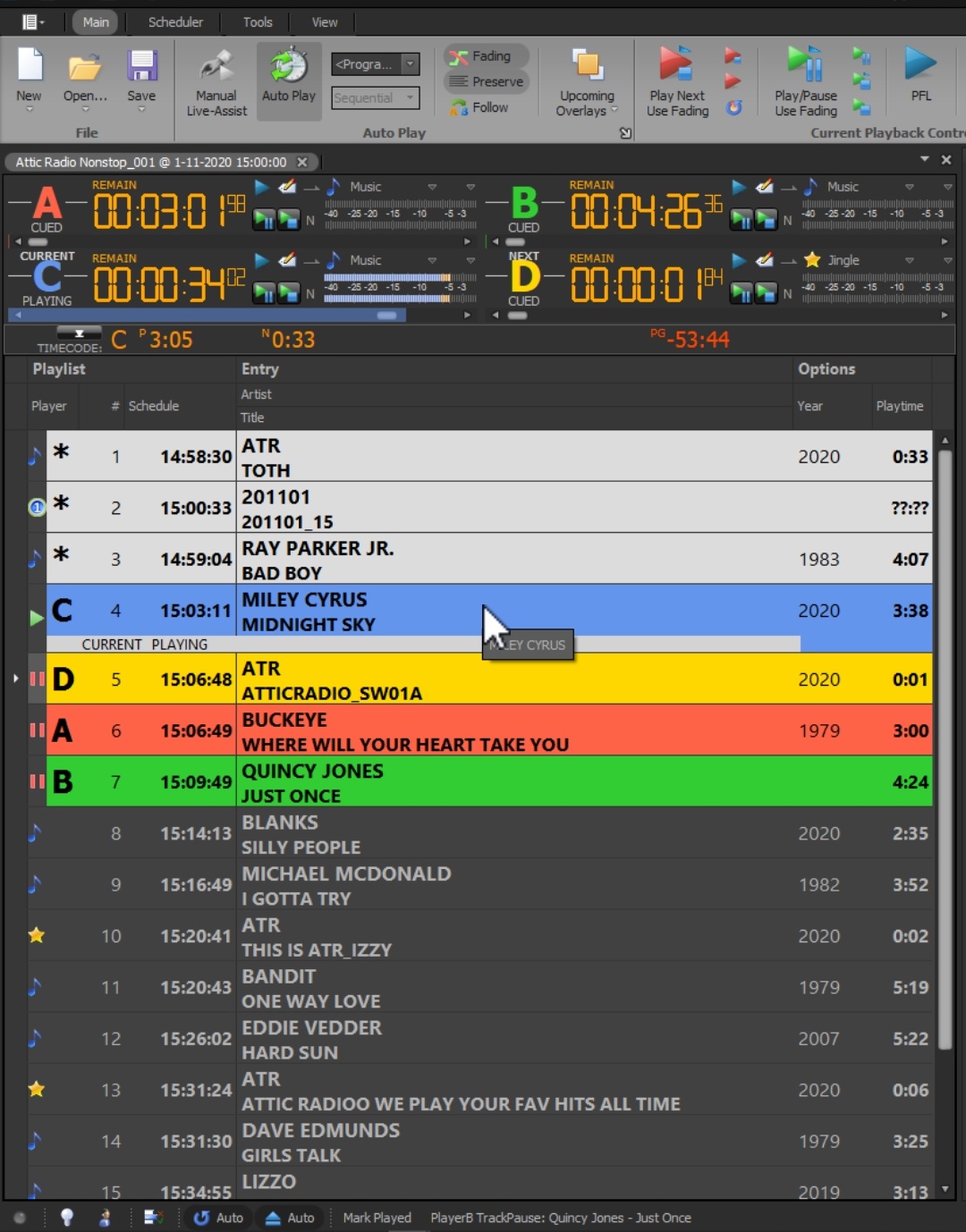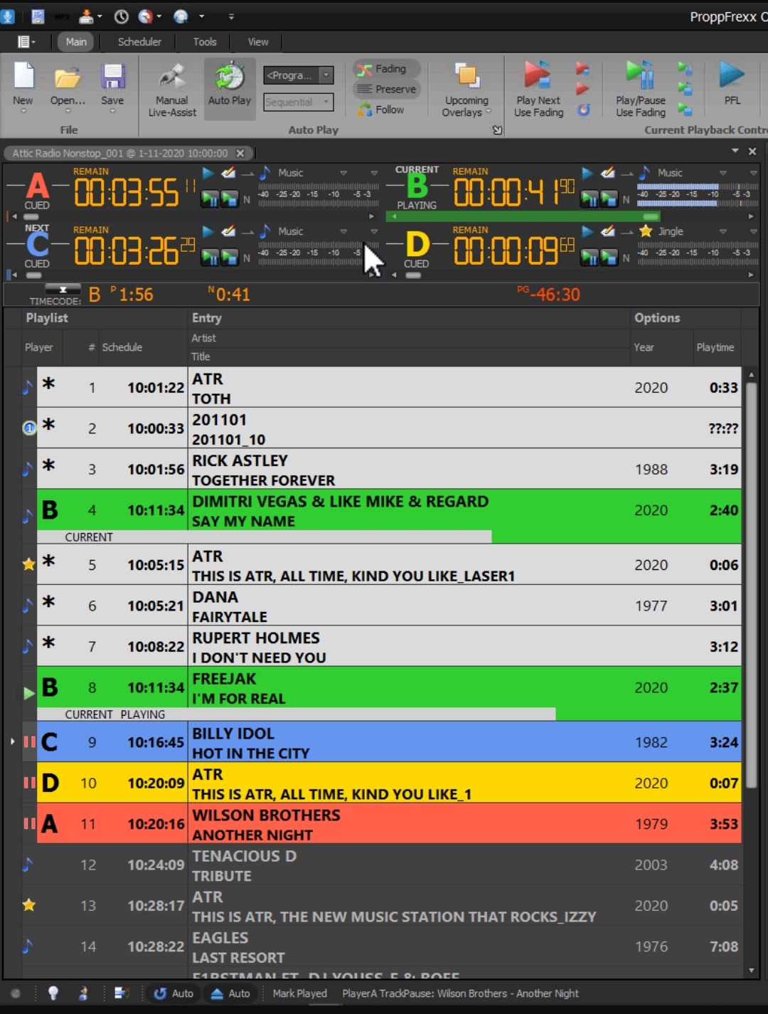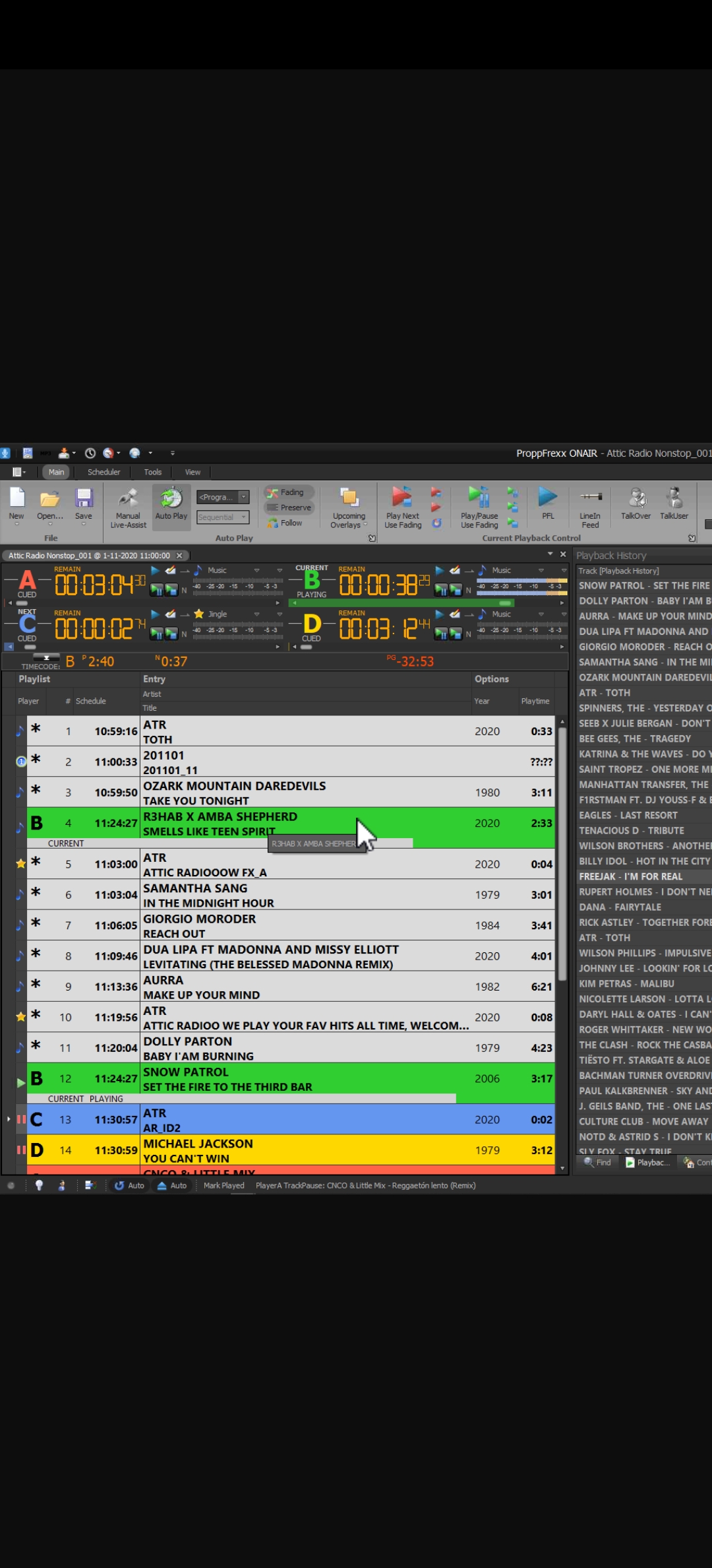 Somtimes after the Top of the hour, pfoa loads player B twice, only the second player B is broadcasted, the first player B is silent, you can see it play but there is no sound so there are no two tracks playing at the same time.