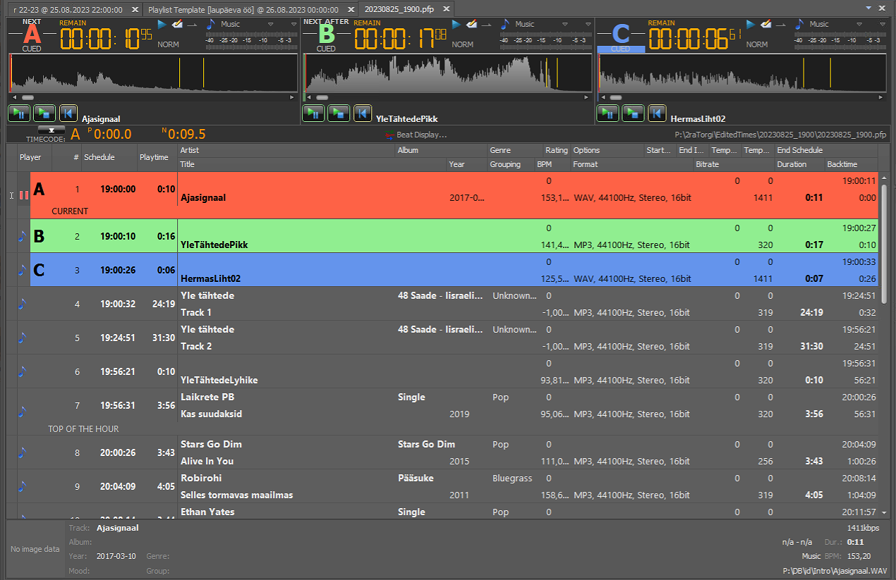 25.08.2023 05:58:37: Program:Playlist Template [kell6 e-r] (Playlist Template [kell6 e-r]), Start:25.08.2023 06:00:00, End:25.08.2023 07:00:00, Started:True