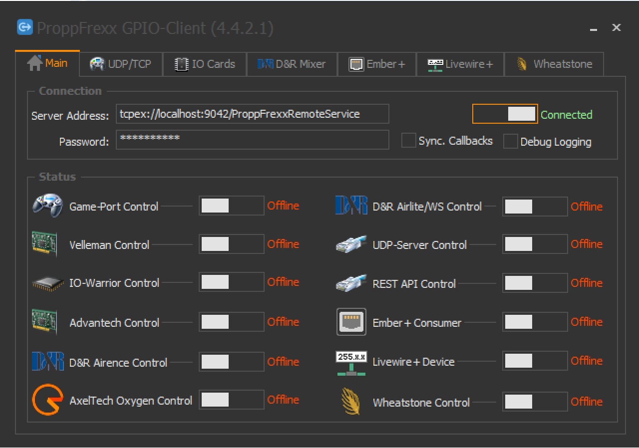The ‘password’ to be used with the “ProppFrexx GPIOClient” application is always the same password as defined in the general settings, section ‘GPIO/Remoting’ for the ‘TCP RemoteControl Server’.
