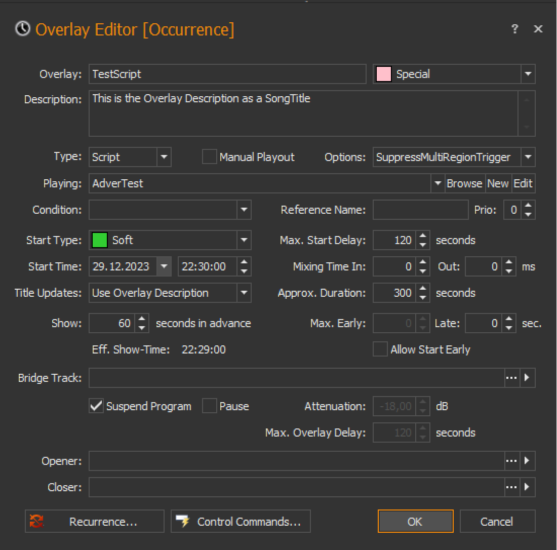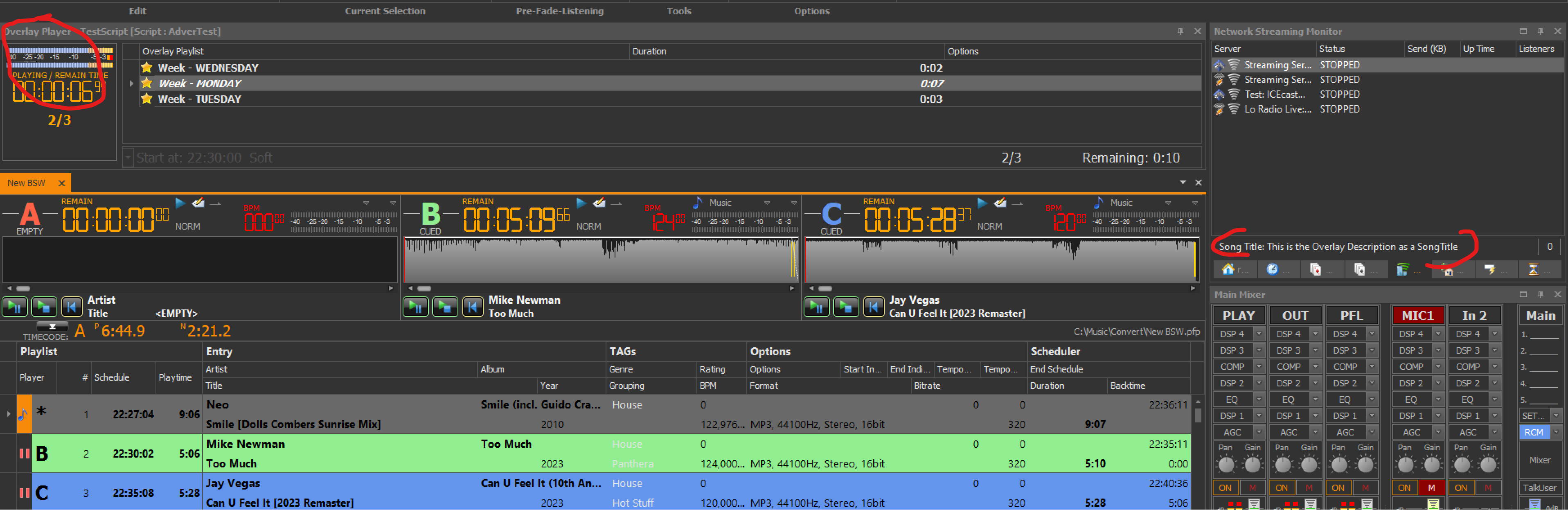 In my tests the overlay (once it started to play; scheduler was running) updated the song title of the streaming servers with the overlay description.