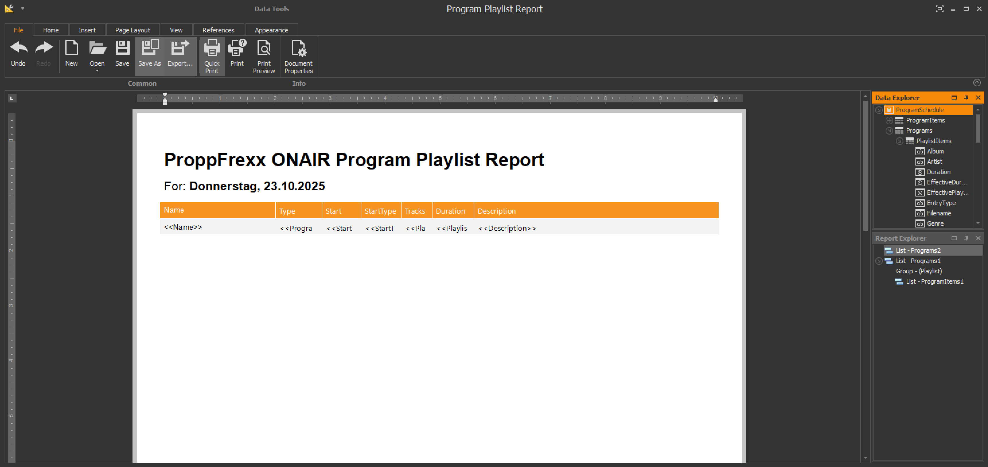 You can invoke the Designer as explained above - then select/open the "Program Playlist Report": You can see all available fields on the right side of the designer. There are for example a playlist entry the following fields:
