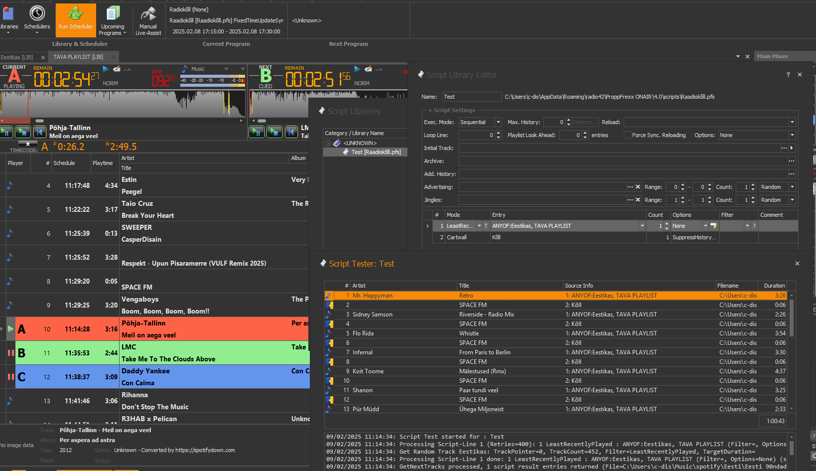 Note, that when the script is executed its script lines are looped (by a playlist which was generated by a program scheduler entry; ie. for a program you define a script to be executed; ie. when the program is started, a new playlist is created and the script is executed for that playlist until the next program is started).