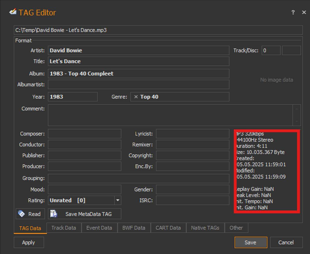You can even click on the 'Read' button at the bottom left to re-read the TAGs from the file. So you don't even have to rescan a media library all the time. This Re-Read is the same of what is also happening when you rescan a media lib.