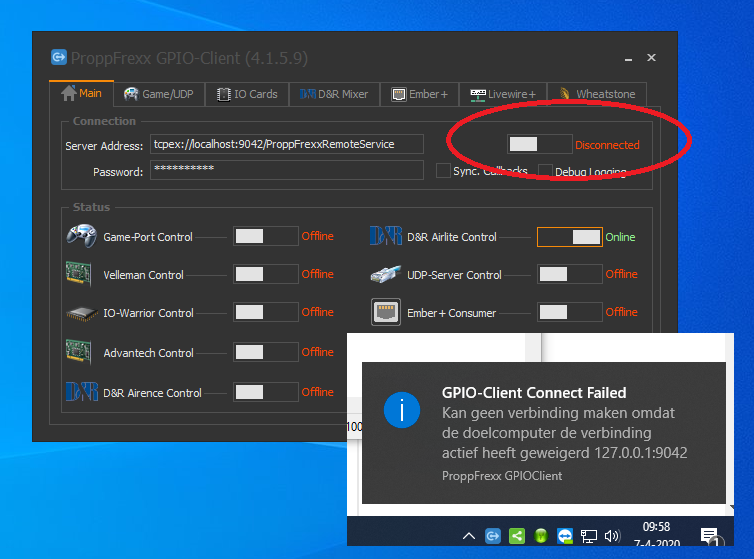 for 1: beside the password (check this with your ProppFrexx ONAIR password in the general settings, section GPIO, under TCP Device - Authorization Password) - you might also completely remove the text in the GPIO Client field 'Server Address'. The system should now automatically discover the existing ProppFrexx ONAIR service in the same computer and populate the address itself again.