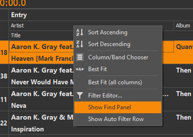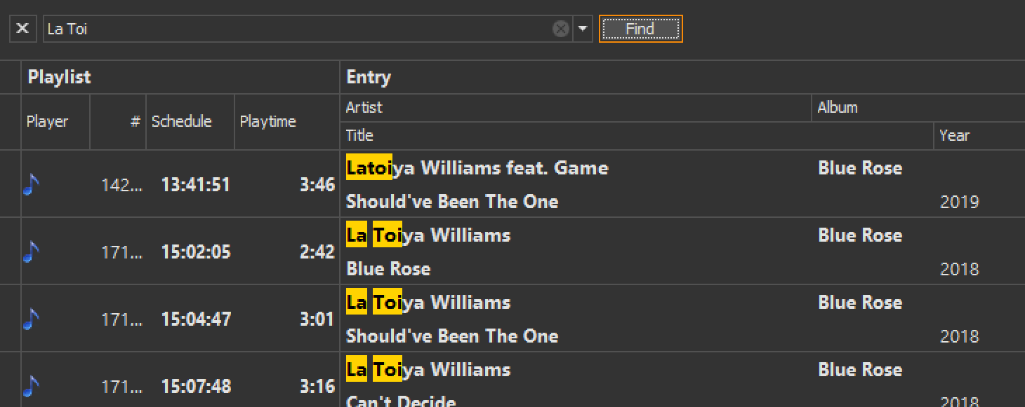 And you can quickly search for tracks in your plalyist by focussing a column (e.g. the Artist) and then you start typing a letter, e.g. 'D' will jump to the first entry with a 'D'. Type more letters to search for Artists starting with that letters.