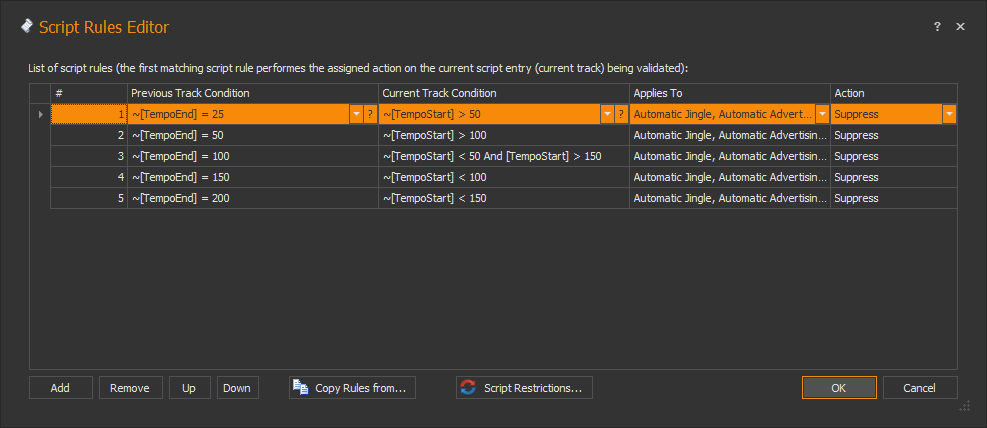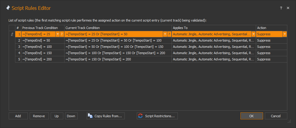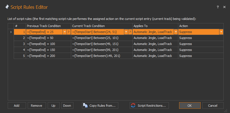 E.g. it says: if the previous track has a TempoEnd of 25 AND the current(next) track has either a TempoStart of 25 or 40, than Suppress that current(next) track!