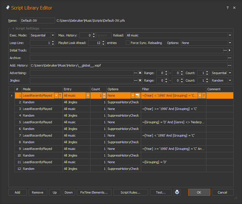 ... Script Rules again (see picture). A much better result, but still some "blind spots". This means that not all script lines give a return, which results in e.g. two jingles played after each other. Do you have any idea where to search for this solution? My standard history is set to Artist history 30 (or 120 min).