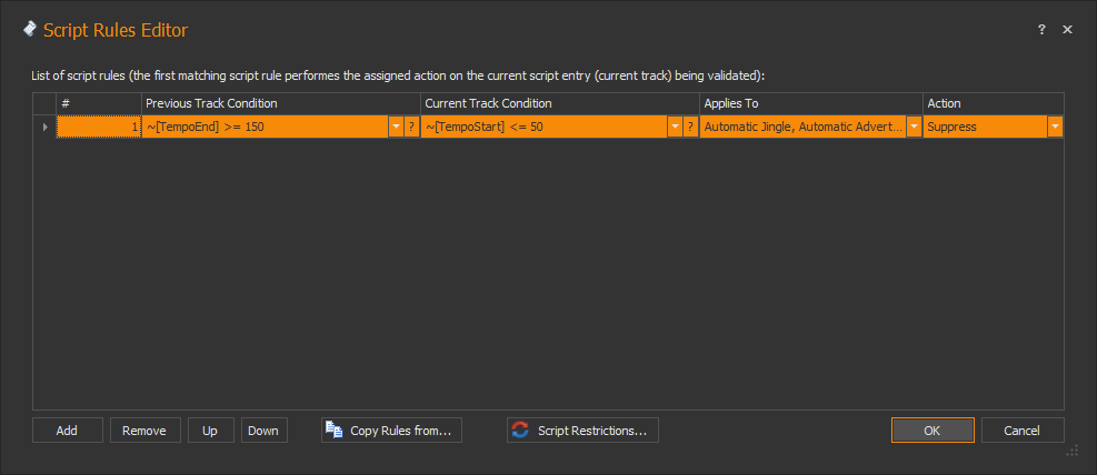 Pfff, I don't get it to work. Even with only one Script Rule line (see attached) the results are poor. I tried to include the test .txt file as an attachment but it does not work. How can I do this? Even the "UseLastTrackOnFinalFail" does not return any hits, so I end up with a playlist with skipped music tracks and double and even triple consecutive jingles. Without the Script Rule it works fine, all tracks are planned and there are no errors. Please help!