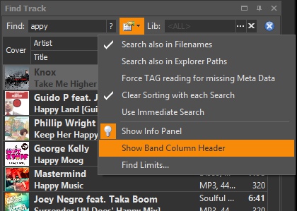 The main tree list windows (Playlist, Find and Trackboard) have been enhanced in its look and feel to allow you to organize the columns in so called bands. Each band grounds a list of columns and even allow you to stack multiple rows not only next to each other, but also underneath each other. The default layout now also already uses 2 stacked columns as shown in the images below.The band column headers might be shown or hidden at any time by using the related menu item. It is recommended to show the band column headers when you edit your layout.