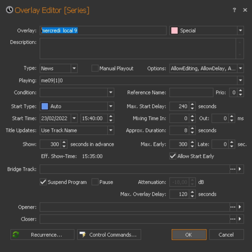 this program is previously recorded using RVT for global announcements, and multi region news using reference track's externally recorded for local content. we need this news overlays to be resolved to playlist to be sure of the place they'll have in the playlist (for the dj to be able to announce what's coming next).