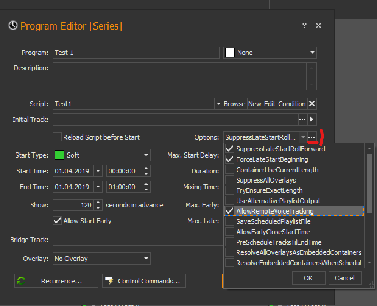 When you now activate the 'AllowRemoteVoiceTracking' option in the program scheduler entry editor, three dots (...) will appear at the end of the options. Clicking on these three dots (...) will open a new dialog in which you can specify the user names allowed to perform remote voice tracking for this entry (if you leave the allowed users empty, all users are allowed): When performing remote voice tracking (RVT) the user now MUST use this user name as the Clientname and password (as defined on the server's UAC) in order to be allowed to perform RVT on that program.