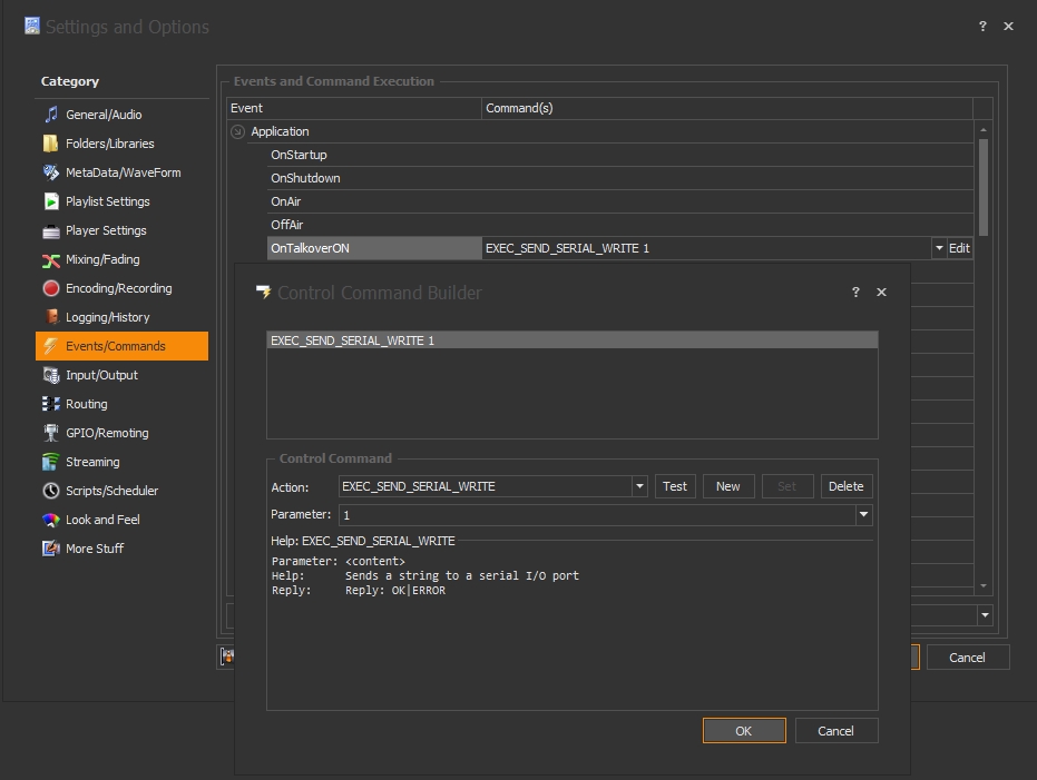 Ich hätte vorgehabt zwei Exec_Serial_Write2 Kommandos in das Event: OnTalkoverOFF einzugeben,