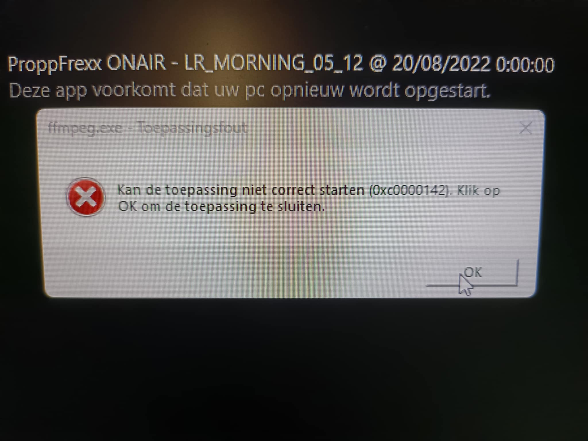 yesterday and today unfortunately proppfrexx has crashed a few times. supposedly by windows we get this error code FFMPEG.EXE cannot start application correctly (0XC0000142). When this error occurs a player remains empty. anyone tips or advice.