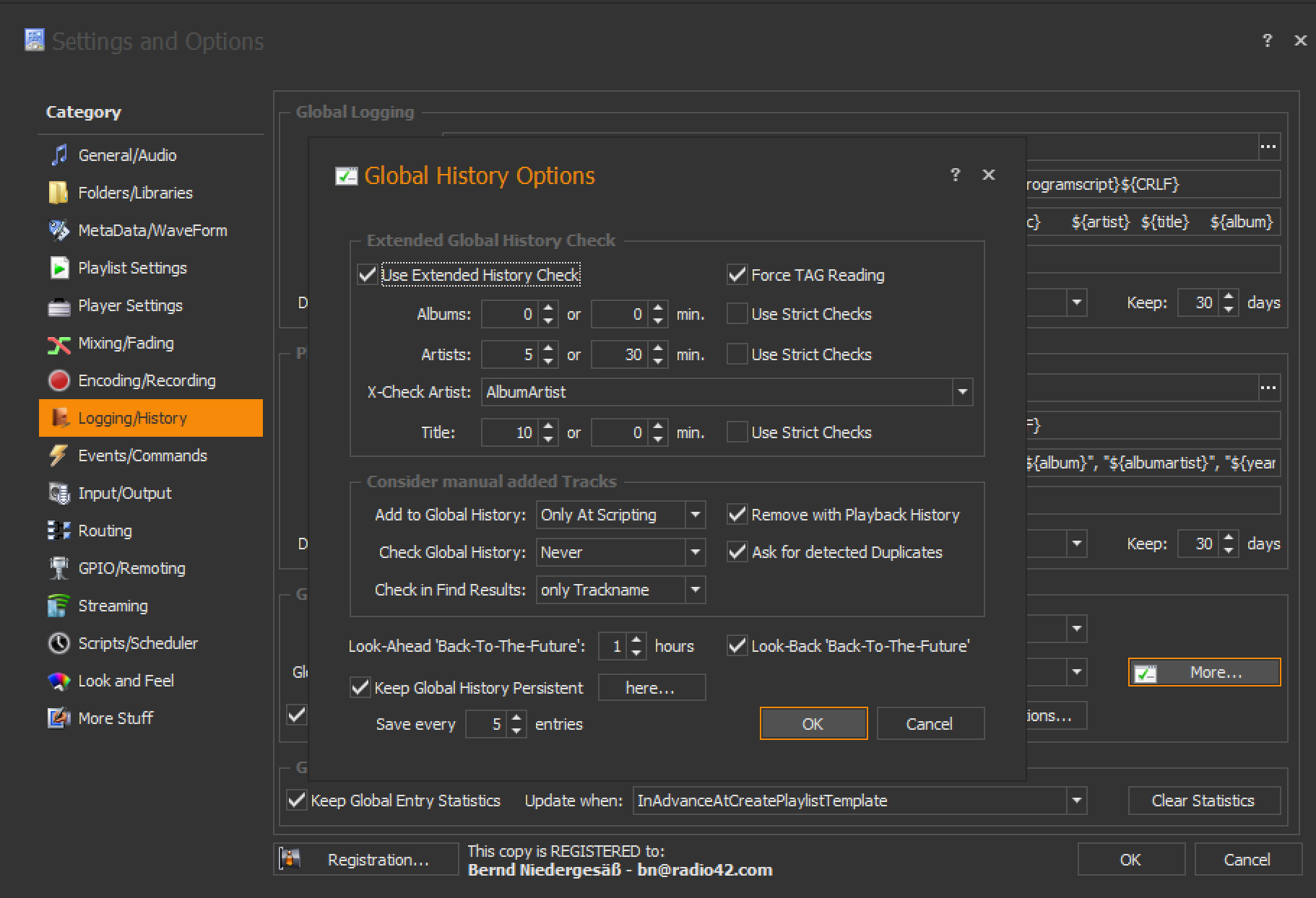 If you however work with pre-generated playlists, those are only taken into account when you set the ... 'Back-To-The-Future' settings: Press the ? icon at the top right of the More - Global History setting: